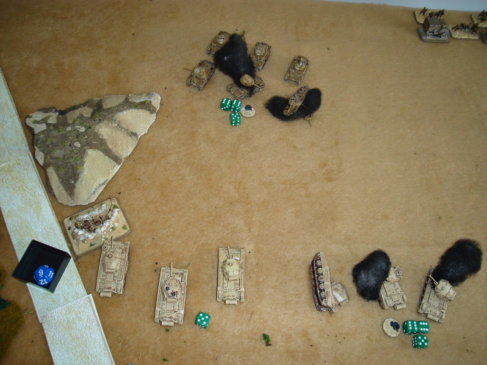 Turn 3. My 5yo son wanted to take a picture [Puhleeeeeze?]. So he went for the dramatic closeup! The limit of the ATGs range is the end of the ruler. British Tank 2 is "sideways" shown by the column formation, but this has no effect on its shooting. It can be argued that the tanks are tightly deployed at the top of the hill to concentrate their firepower. The LoS rules say that "other enemy Units" block LoS, but I'm thinking that it's a typo and should be "other friendly Units" block LoS. Angle of shooting is 360, and measured from any part of the base.